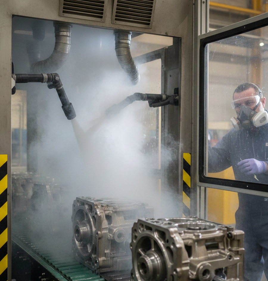 Industrial cleaning of components with detergents or chemical solvents. The vapours and organic compounds generated require effective extraction systems to protect operators and meet environmental regulations.