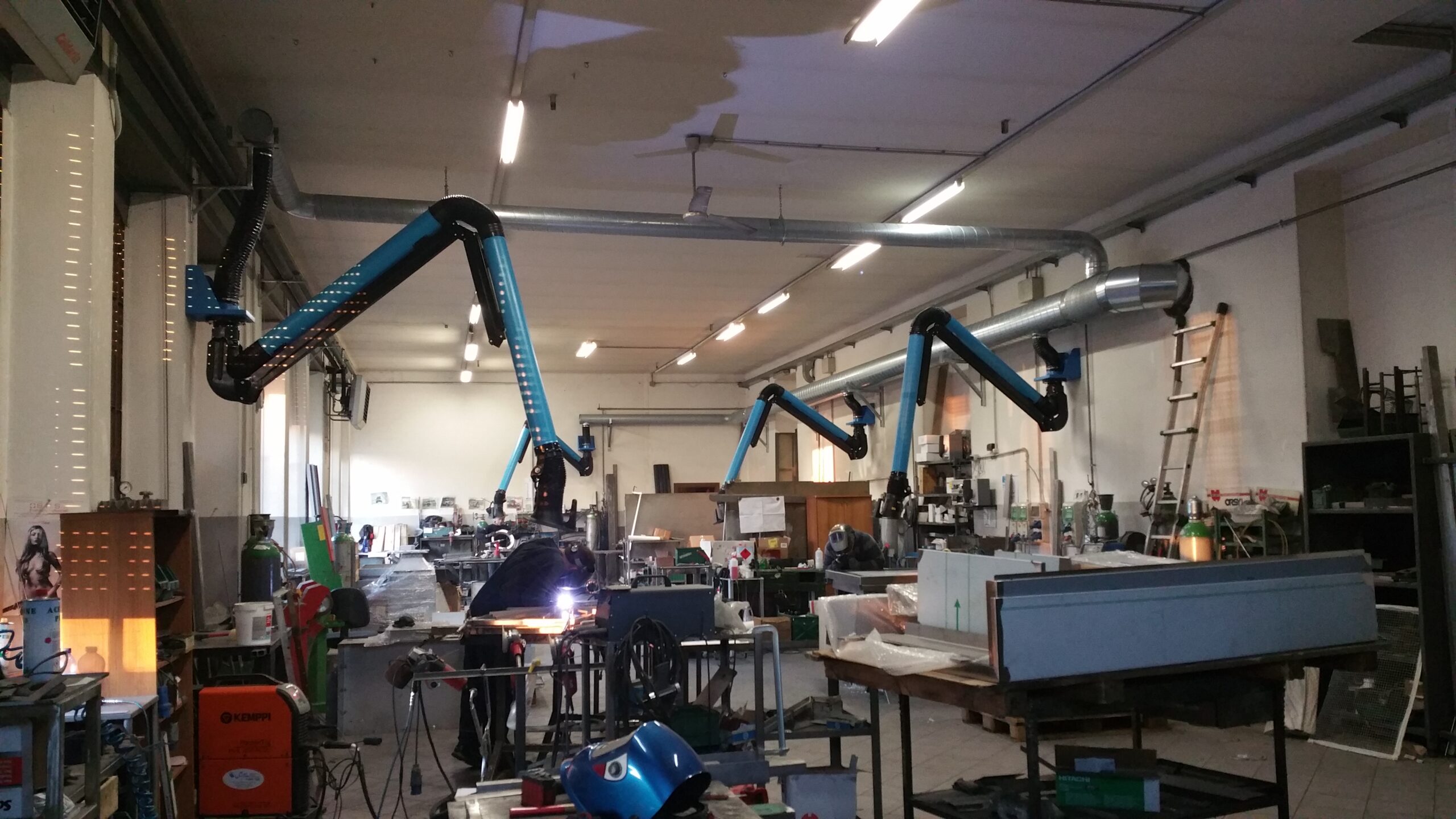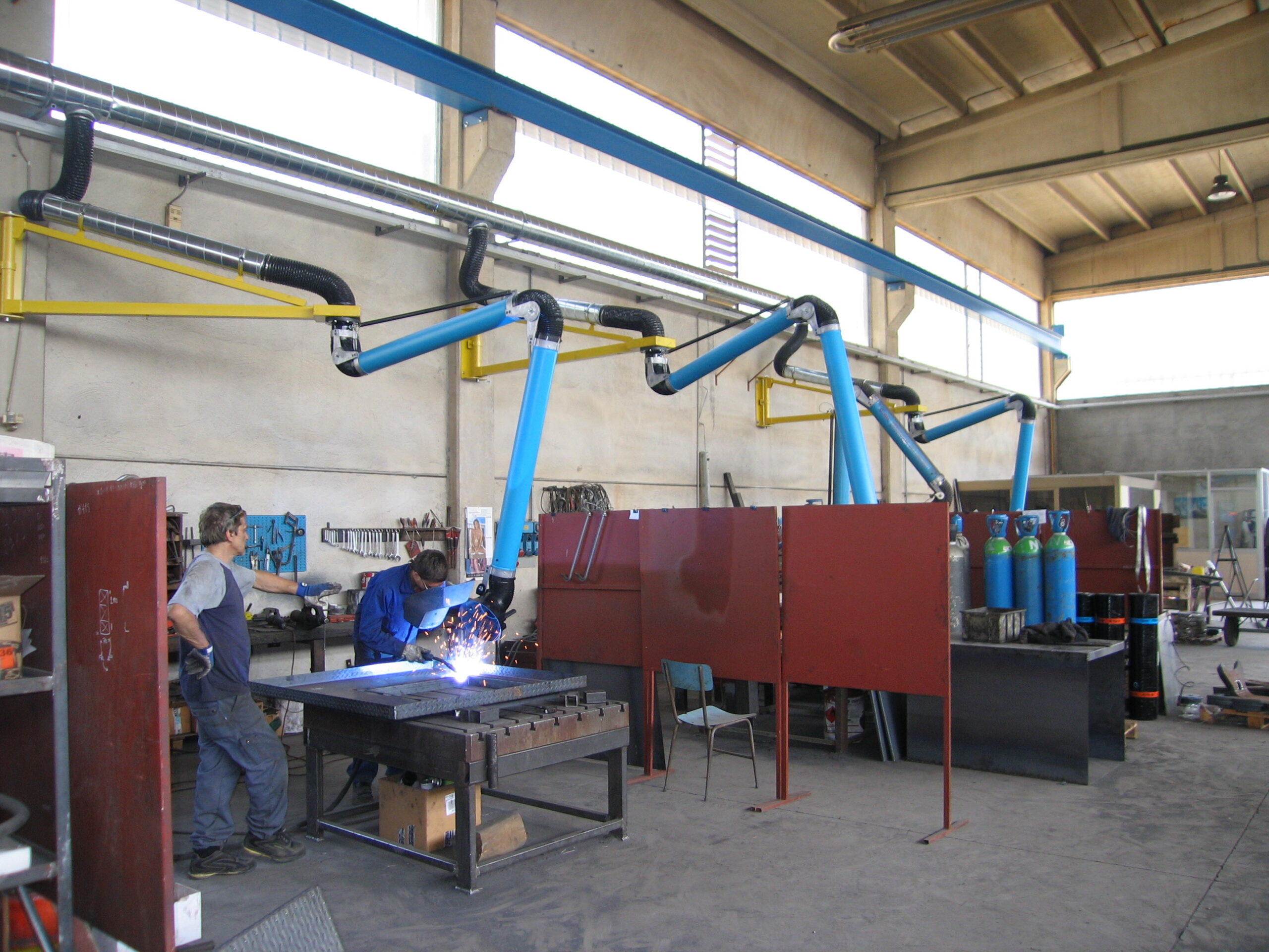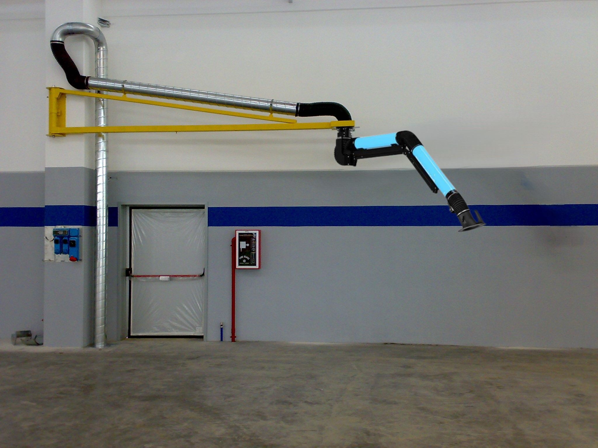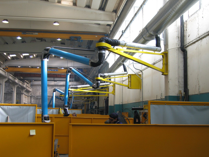 Articulated suction arm for localised collection of fumes, dust and vapours directly at the source, with wall or trolley filter attachment.