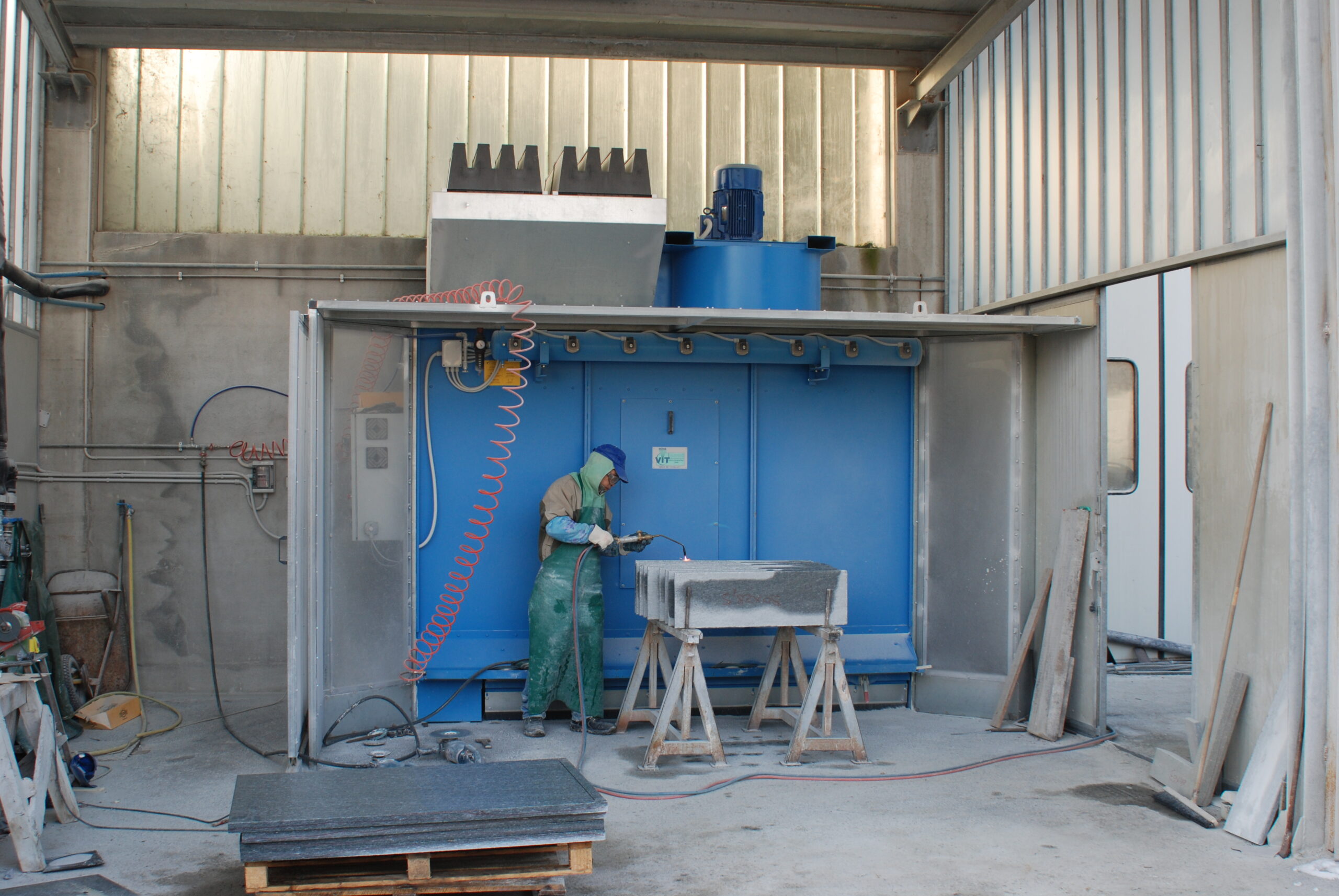 The Suction wall for dust from processing marbles, stones, granites, and resins is suitable for grinding and polishing operations involving marble and stone, as well as resins and composite materials, where it is necessary to contain dust. The configuration can be adapted to a single workstation or integrated into an existing extraction system, helping to keep the working air more stable and controlled.